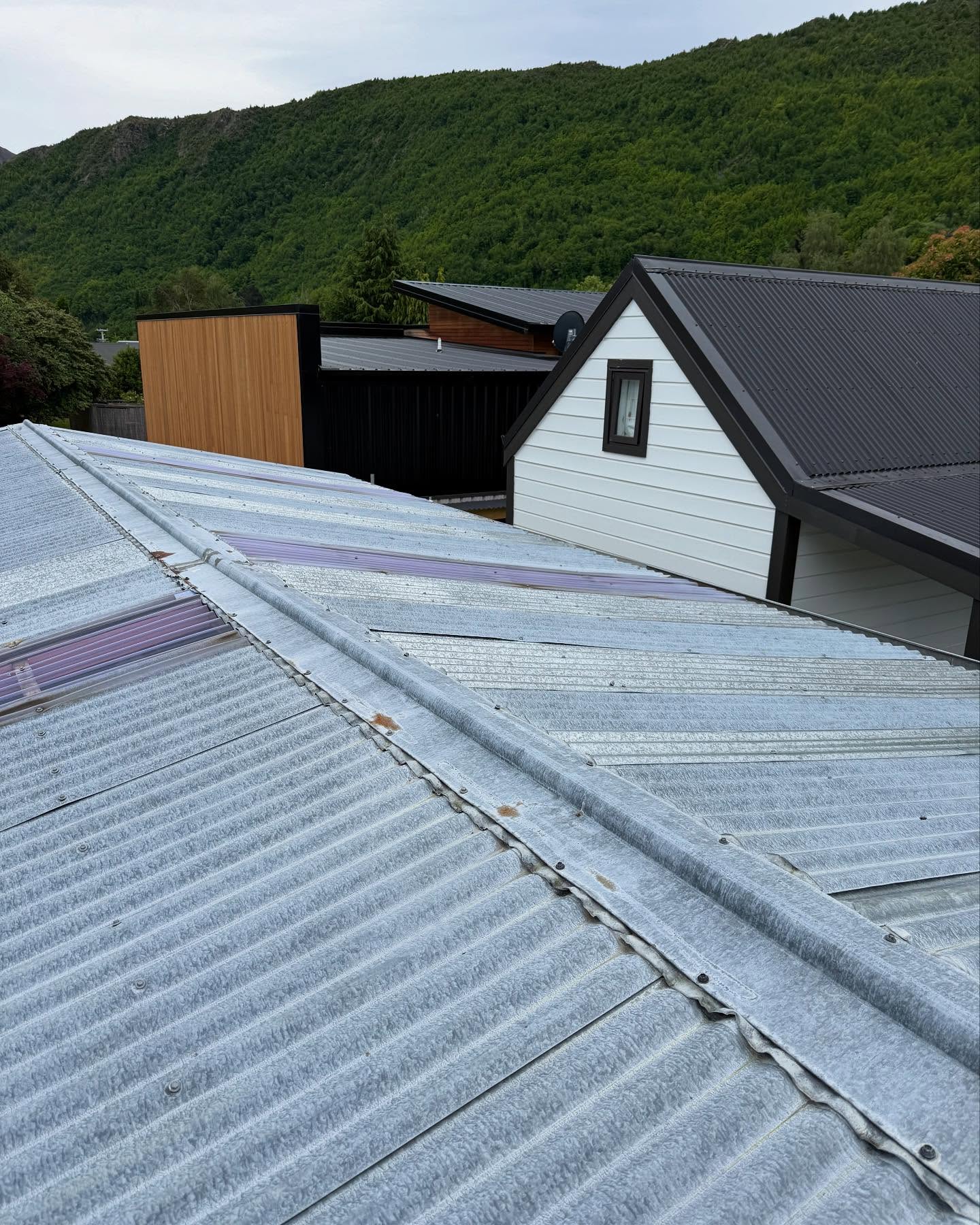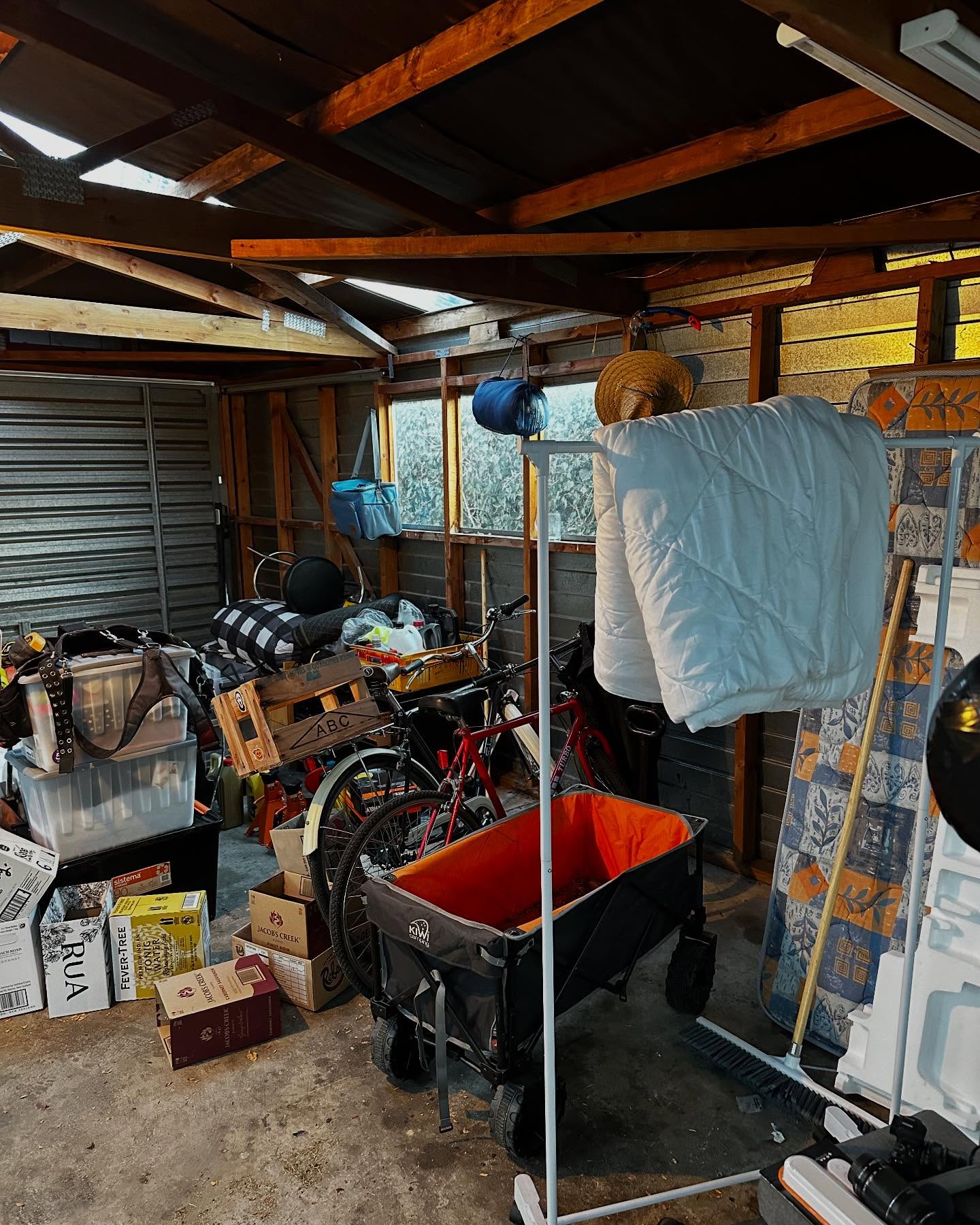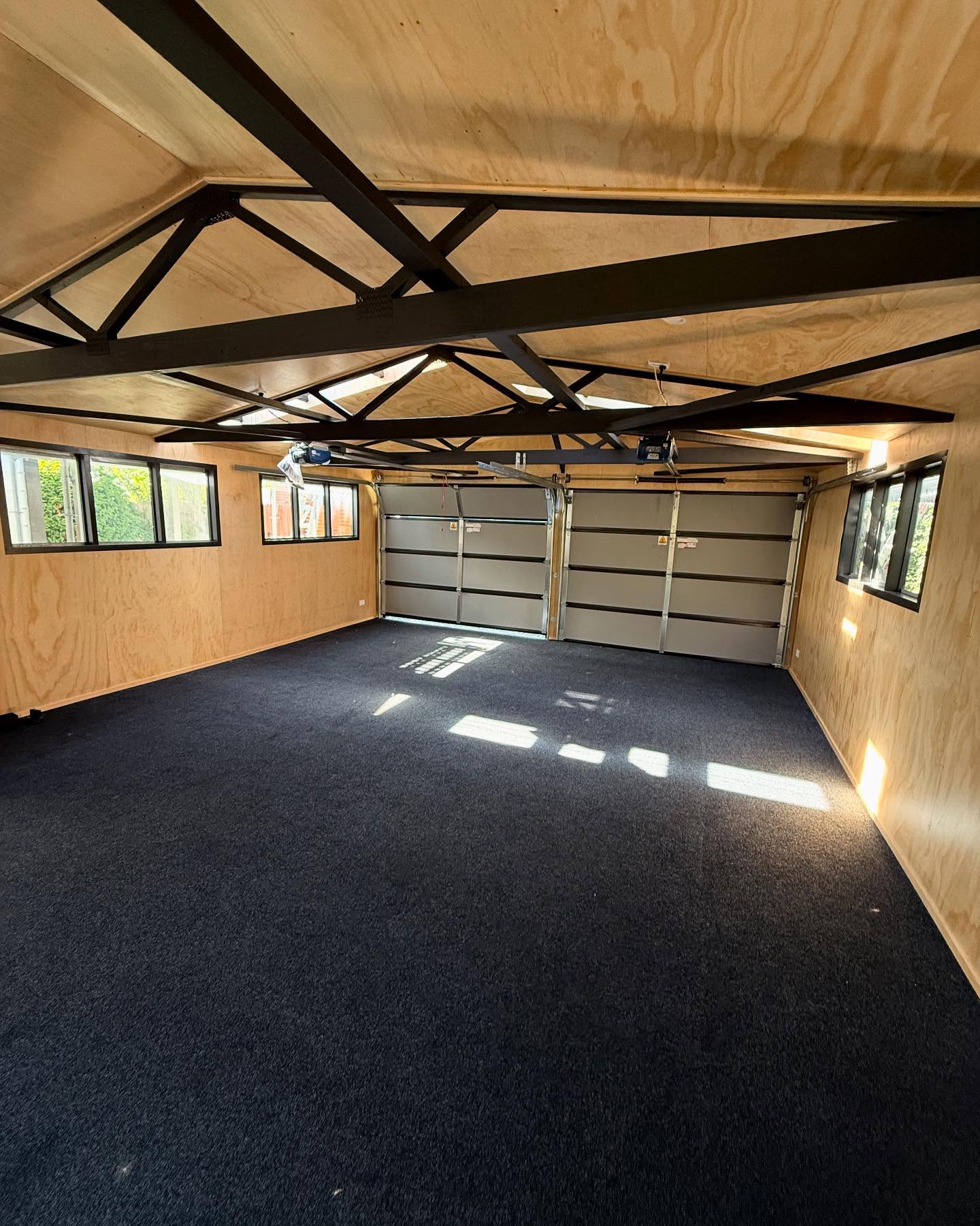 Using the existing structure we have fully insulated and lined with tiger ply, custom window flashings, new insulated garage doors and corrugate roof.