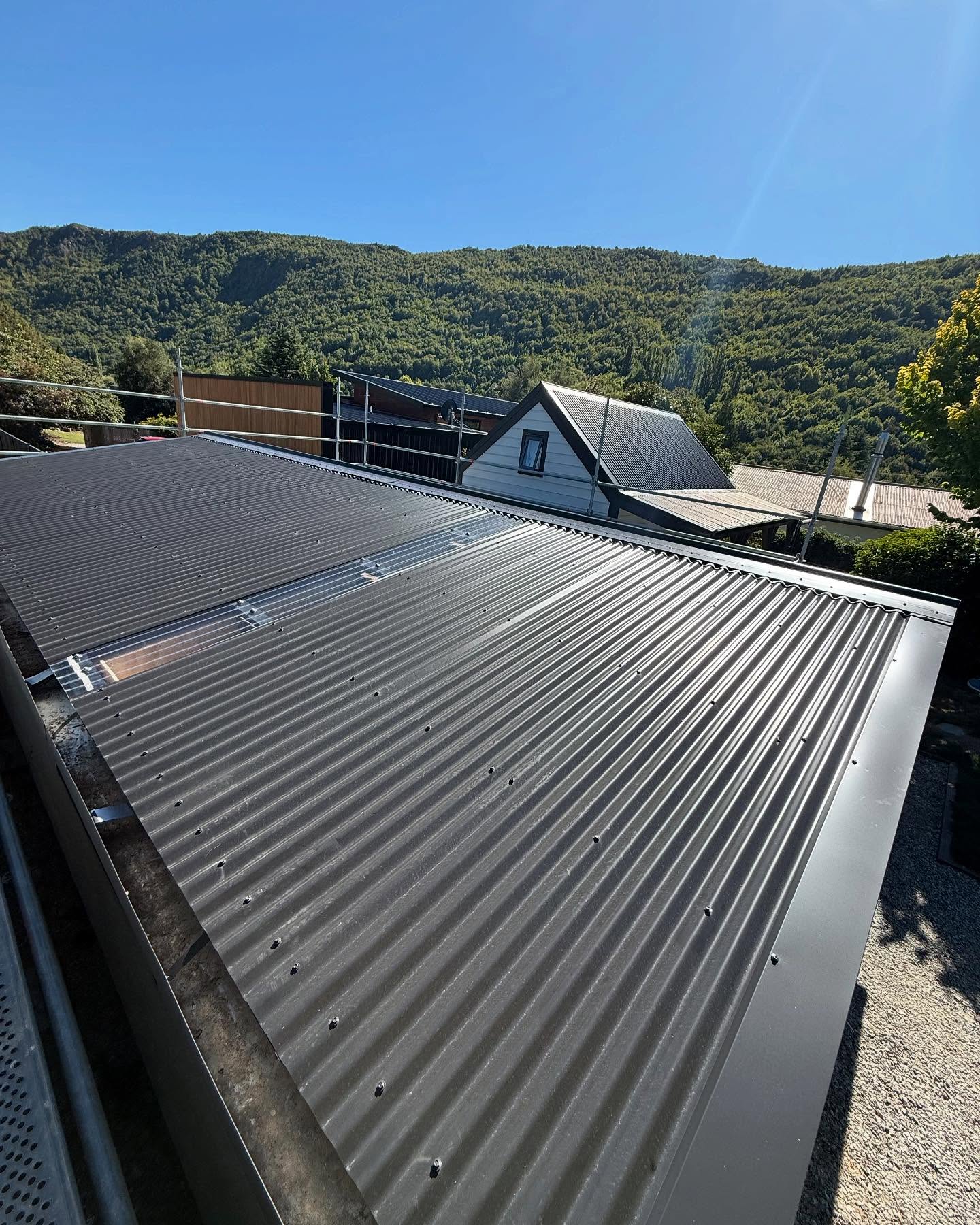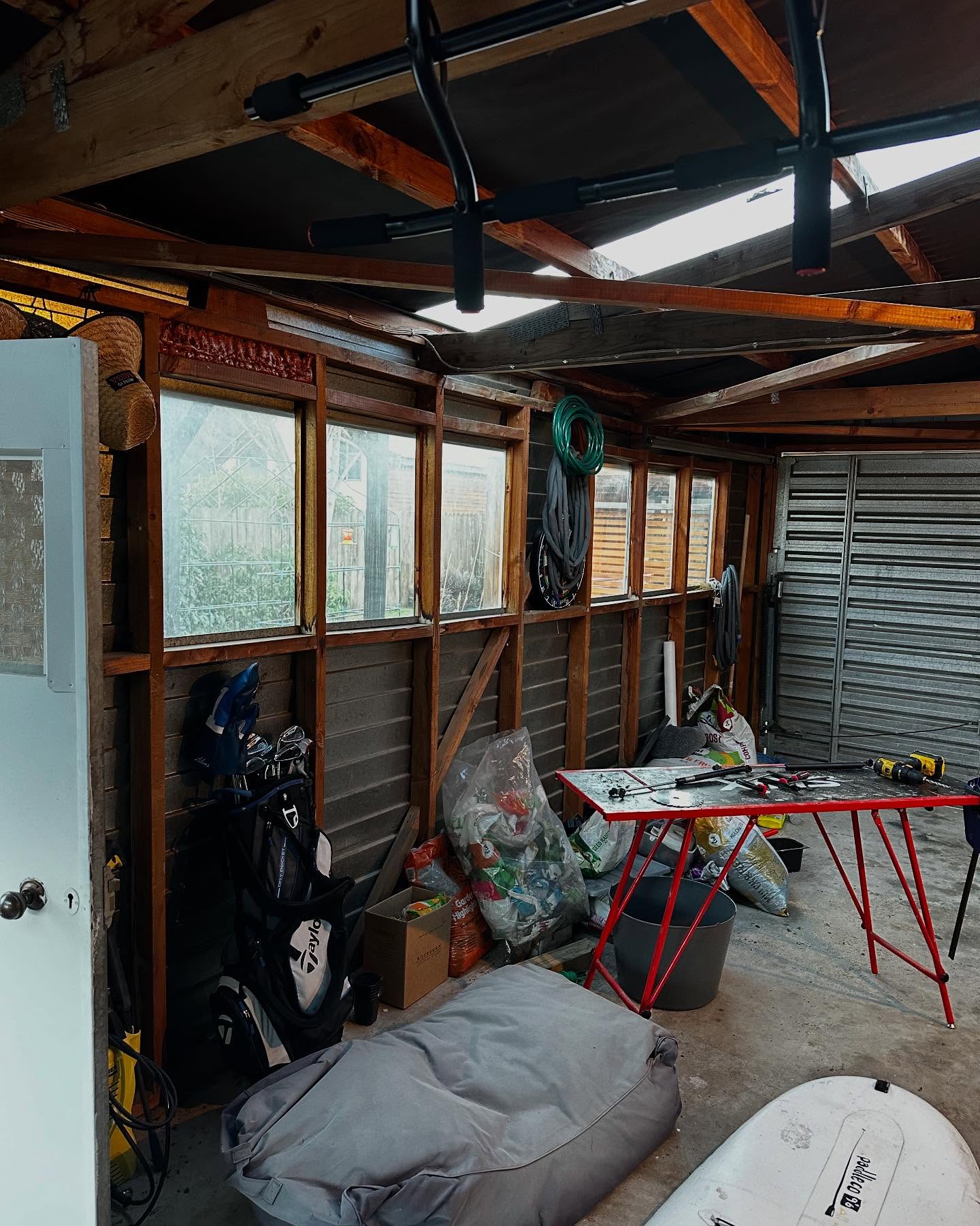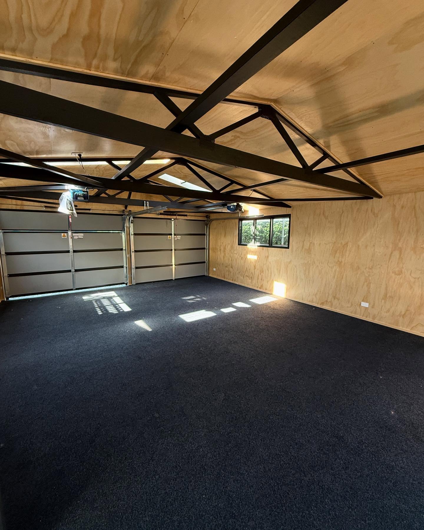 Using the existing structure we have fully insulated and lined with tiger ply, custom window flashings, new insulated garage doors and corrugate roof.